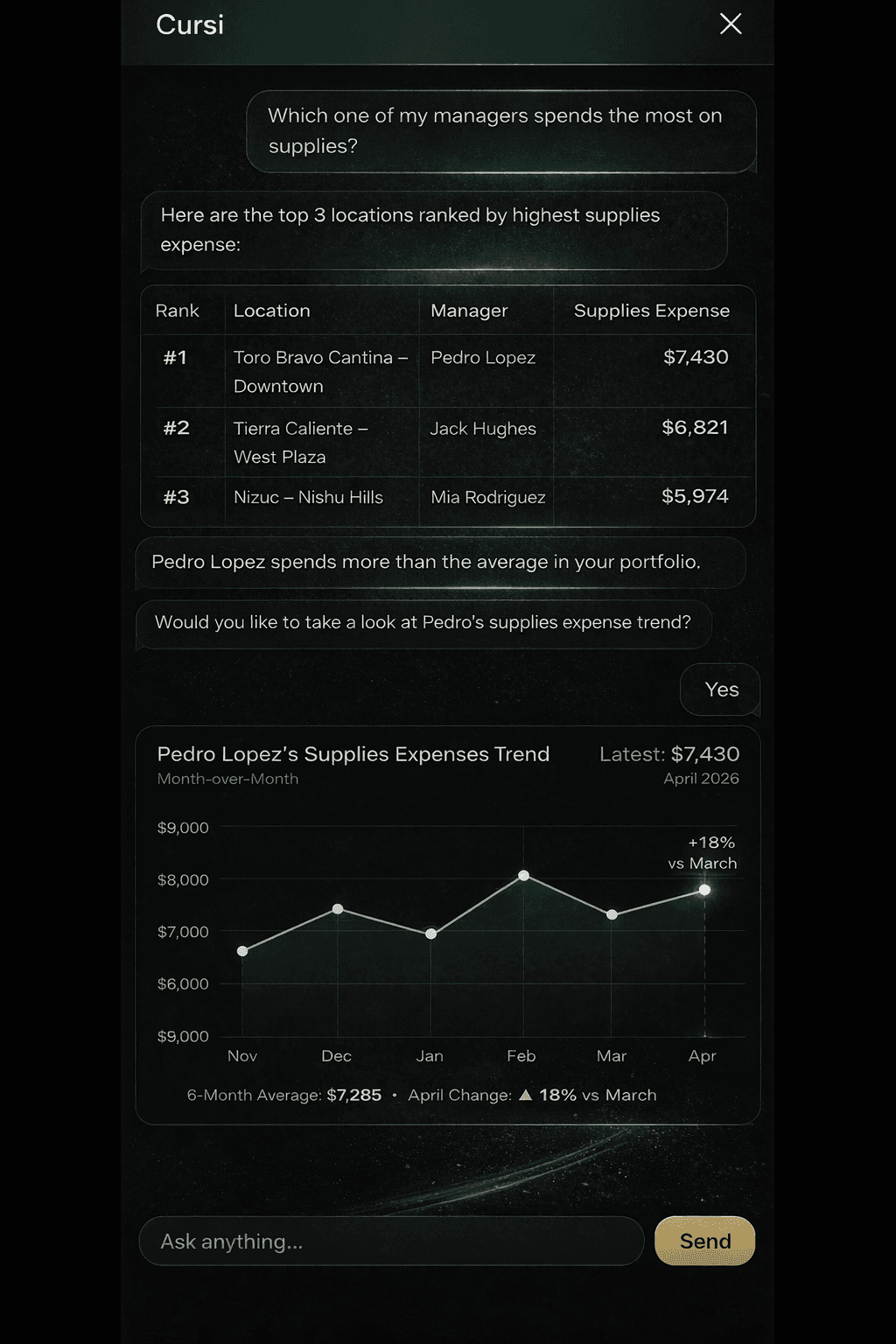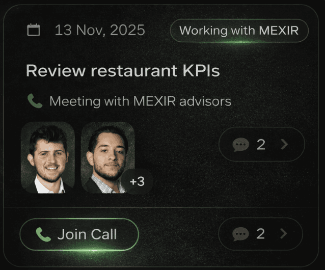 Talk to MEXIR anytime about your restaurants' performance, your goals, and what it takes to achieve them.
